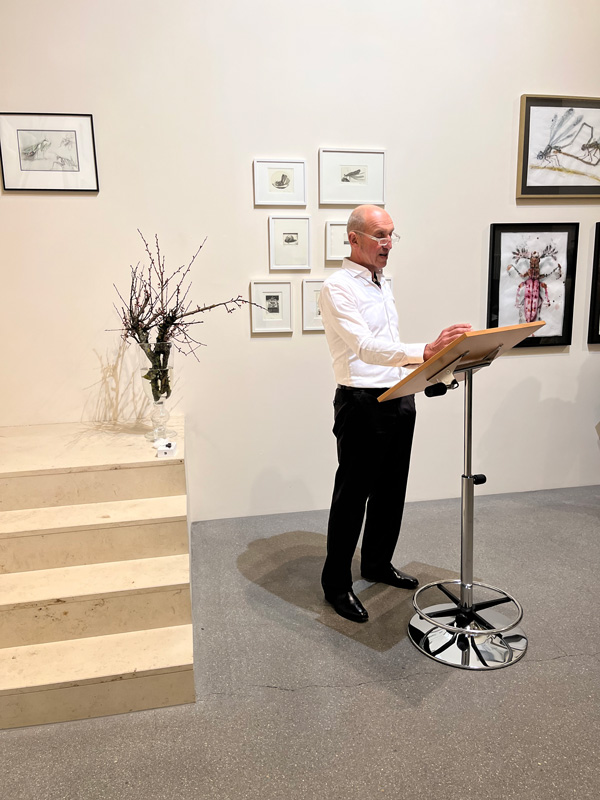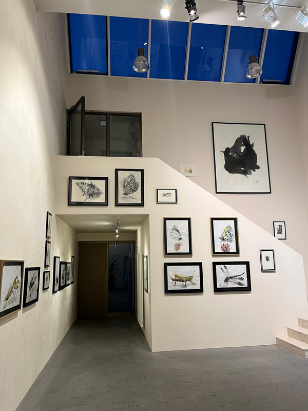 „Während meiner Residency im Kloster Dornach 2023 ist in Erinnerung an Maria Sybilla Merian (1647-1717), Naturforscherin, Künstlerin und Verlegerin, eine umfangreiche Reihe an gezeichneten Insekten im großen Format entstanden. Um mich mit Pflanzen- und Insektenformen vertraut zu machen, habe ich die Merian Gärten, den Botanischen Garten, sowie die entomologische Abteilung des Naturhistorischen Museums in Basel besucht. Ich habe Skizzen vor Ort angefertigt und mich an in Kunstharz gegossenen Käfern sowie Dokumentationen in alten Naturbestimmungsbüchern orientiert.